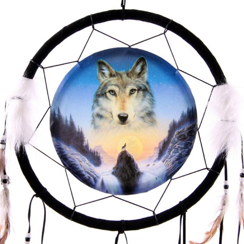 This beautiful wolf dreamcatcher is made from printed canvas and embellished with feathers and beads.